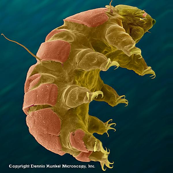 Tardigrades (commonly known as waterbears or moss piglets) are small, water-dwelling, segmented animals with eight legs. They are one of the most complex of all known polyextremophiles. (An extremophile is an organism that can thrive in a physically or geochemically extreme condition that would be detrimental to most life on Earth. Tardigrades can withstand temperatures from just above absolute zero to well above the boiling point of water, as well as pressures greater than any found in the deepest ocean trenches, ionizing radiation — at doses hundreds of times higher than would kill a person and have lived through the vacuum of outer space. They can go without food or water for nearly 120 years, drying out to the point where they are 3% or less water, only to rehydrate, forage, and reproduce. |