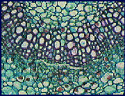 If you like a challenge and have access to sectioning facilities eg a bench microtome, the cross sections of evergreens can be very attractive. The left and righthand images shown are stained cross sections of privet and yew respectively prepared by the author on a course for amateurs.