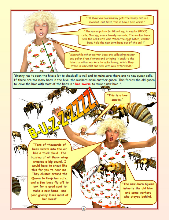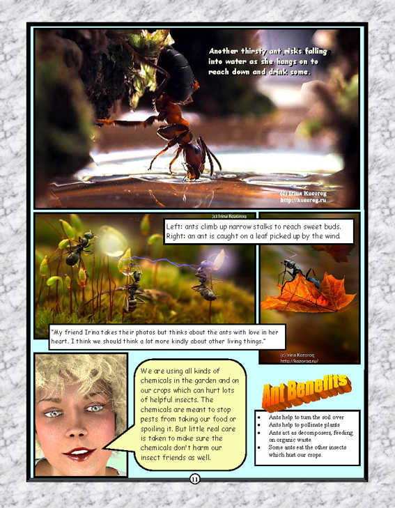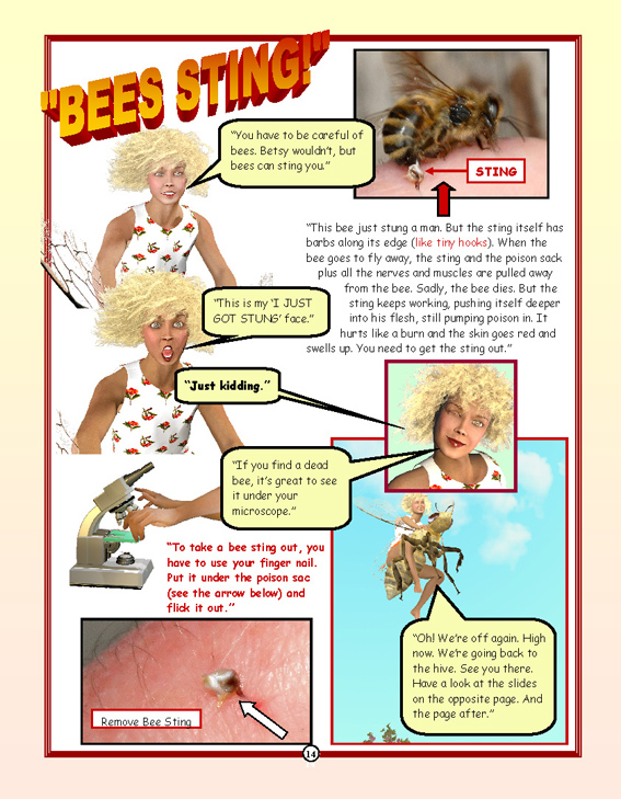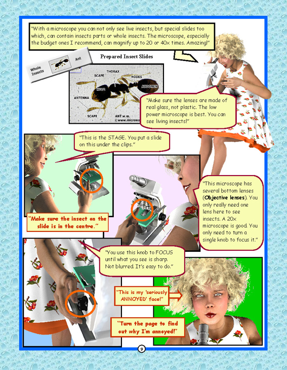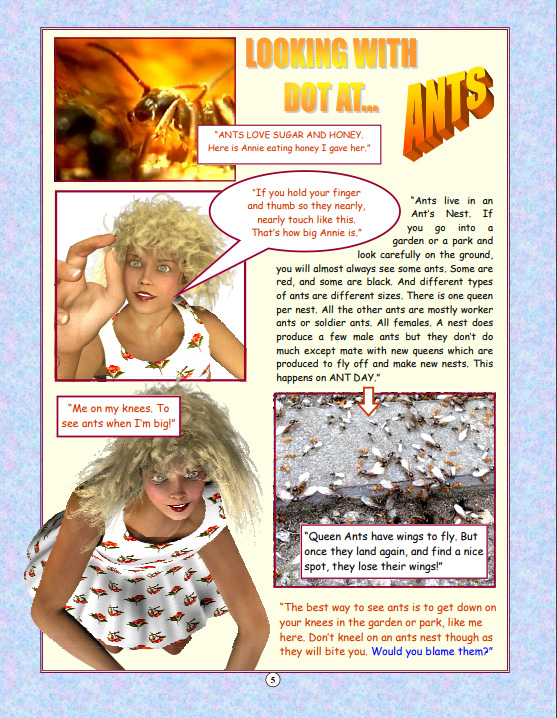 Dot can shrink. She takes adventures into a whole new world, the natural one all around us but often not so readily seen. It is the world at the macroscopic and microscopic level. Dot can talk with the insects, take rides on the backs of dragonflies, take nectar from a flower. She shares her adventures in as series of colourful books helping her younger friends to share her knowledge in exciting and innovative ways. The series is a new order of books in the process of educating young people in a entertaining way, with a support site here and additional resources for each book. Examples from the book 1 pages are below... |
