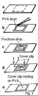 of the cover slip, release the slip - letting it float down onto the PVA glue walls. The Fructose should