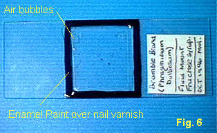 Take care when applying the dabs so as not to move the cover slip or spill varnish onto the central area of the cover slip. Put the slide to one side for 5 minutes to let the varnish dry. Be sure to return the brush to the bottle right away so the varnish doesn't dry on the brush itself.