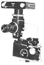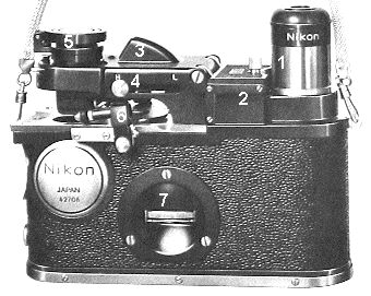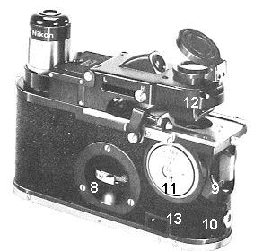 Nikon Model H (left side) in operating position8) Focusing wheel with lock