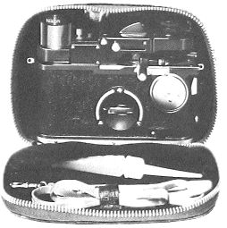 Model H in reinforced leather case with accessories compartment. Protective holder for an extra objective is partly hidden at top under zipper. Immersion oil dispenser and carrying strap also shown.