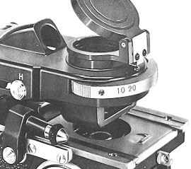 12. When changing to the highest magnifications (40x or 100x objectives), reach to the side for either of the two chrome slider knobs that return the condenser front element to the optical axis (position "H"). This can be done without looking away from the eyepiece.