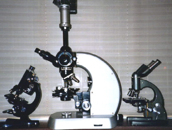 This shows three of my microscopes. In the centre is my Zeiss Universal, probably dating from the 1960's. On the right of this is a Baker Series IV BQ, a fine example of a quality British instrument. On the left is a Beck London 47, fully resplendent in black and chrome.