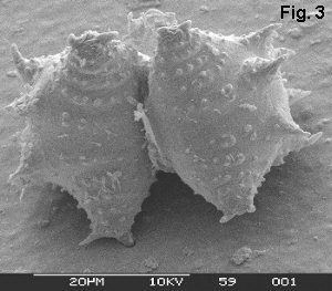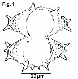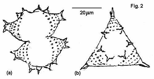 The specimens of St. monticulosum examined correspond with Nellie Carter's (1923) original figures of the typical form from Loch Luichart, Ross, Scotland. With the exception in some specimens, there is a smaller third spine which can be seen at the angles of the triangle in vertical view and the lateral angles in face view. The species occurs quite frequently in the sample collected this year (1997) although it was not seen in a sample collected from the same boggy area in 1993. See the scanning electron microscope photomicrograph and figures below.