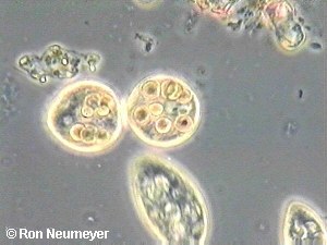 A second protozoan (lower centre) approaches the protozoan (centre) undergoing binary fission |