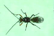 The parasitoid wasp Dinocampus coccinellae is threatening to cause severe problems to agriculture and horticulture in Scotland. Studies by Irene Geoghegan of the Scottish Crop Research Institute in Dundee have shown that in the Dundee area, up to 70% of the seven spot ladybird (Coccinella septempunctata) is infested by this native wasp species. | |