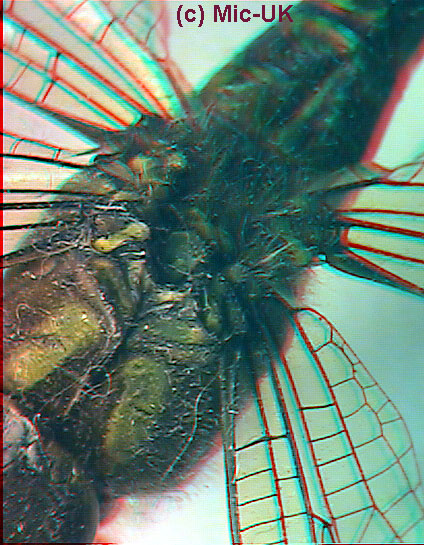 Air is driven in and out of the tracheae through open spiracles, keeping the muscles supplied with oxygen, through the action of the thoracic plates. These move vertically and sideways in reaction to the wing beat causing volume changes in the thorax - (not quiet a jet engine but a very efficient fuel supply mechanism). Dragonflies need lots of heat. On cold overcast days, it is unlikely to see them in flight. Large hawkers are unable to fly if their thorax (above) is below 30 deg. C. and darters (smaller dragonflies) need at least 16 deg. C. Sun-basking by perched dragonflies can help to raise the temperature on the thorax 5 deg. C. more than the surrounding air. It is quite common to see many dragonflies perched in parallel, often on rocks where additional heat can be absorbed! |