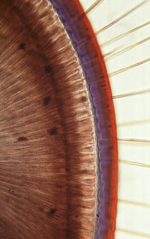 crystals. Even more amazing is that these lenses are biconvex, composed of a doublet, a construction developed by Huygens and `Descartes, to correct for spherical aberration. Evolution constructed these eyes half a billion years before man thought of it! the eye of a trilobite (5 mm. wide) |
