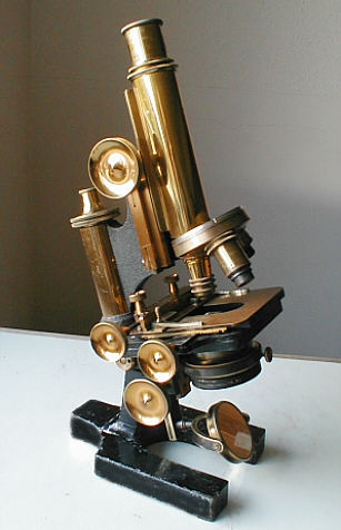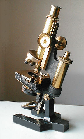 The microscope came with many interesting sundries, including Nicol prisms, (Iceland spar crystals) for polarizing work , each held in cork , and housed in a rotating brass body, a low power silvered vertical illuminator, and a divergent or bi-concave optic in a brass mount with RMS thread which attached to the bottom of the draw tube to increase the image scale. All in all enough to keep a 16 yr old amused for a very long time !