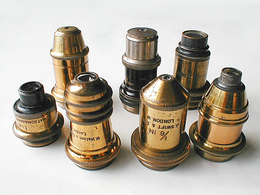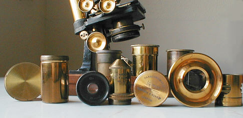 The 5 achromatic objectives, 2", 1", 1/2", 1/4" and a 1/6", each with its own brass screw top 'can', were a mixture of the maker's, and some 'no name' objectives, plus two eyepieces, both Huygens. My favourite objective was the Watsons 'Parachromatic' 1/4" which had a large NA of 0.68, which is on the high side by modern standards, and was a work of mechanical and optic art. There was no oil immersion lens, which was just as well I think in retrospect, for this requires delicate handling and some understanding in use, and could easily have been damaged by a young person. For practical reasons I replaced its original two objective turret holder with a triple mount, which is the only alteration it's received. The original I still have.