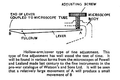 One of the many features I like about this microscope is the fine focussing mechanism, being an excellent example of the screw lever principle. It carries its movement through a dovetail slide, immediately behind that of the coarse focus. It looks dated of course, but simple ideas well executed are a treat to use, and it has a little feature worth describing for those who have not seen this before.