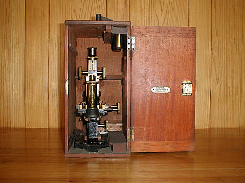 On the first evening after we'd moved, I noticed an old Honduras Mahogany case with a brass tubular folding handle on the table. My father indicated that it was for me and that I should have a look inside to see what it was. I remember that very first 'meeting' with the Watson microscope, and the general sense of awe that I'd got something rather classic and special has not faded from my memory. The rest is personal history of course, but the microscope he'd bought for me marked the beginning of a lifelong hobby, which at that time he couldn't have realised.