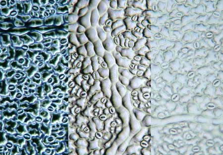 | This image of the surface of a leaf shows the differences in contrast between these types of illumination. Bright-field illumination has very limited contrast. This image clearly shows that it is very useful to experiment with contrast techniques. Oblique illumination gives a relief-like enhancement of contrast. In 19th century microscopes there was often an arrangement for oblique illumination. Early microscopists knew that this technique has great advantages! Dark-field illumination is also one of the most rewarding techniques. Objects smaller than the resolving power of the objective can also made visible simply because they light up! It is thought that Antony van Leeuwenhoek observed bacteria using a kind of dark-field illumination! The image on this page is of a cast of the surface structure of a leaf complete with nerves and stomata. With the aid of nail varnish it is easy to make perfect casts. Read more about this technique next month!