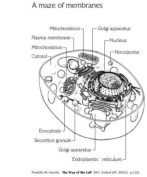 | In The Way of the Cell, Franklin M. Harold presents a diagram entitled "A Maze of Membranes." It shows the mitochondria, Golgi bodies, and related cellular elements in a way I'd never seen before. After re-drawing it for myself, I realized that other Micscape readers might find it enlightening, too. If you print it out—it fits easily on an 8½" by 11" sheet of paper—more details will be visible. |