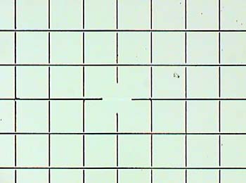 When setting up a microscope for image projection e.g. into a camera (either film or digital), for video or onto paper for drawing by camera lucida, it's very important that the field is flat, evenly lit and free from aberrations; in particular those that relay lenses or eyepieces may introduce if not well matched. (See Ted Clarke's recent article which illustrates the importance of matching optics for image projection).The grid eyepiece reticle is a particularly useful slide subject for checking for major faults in the projected image as the eye is good at spotting even slight geometrical distortions when compared against the rectangular border of the image frame.