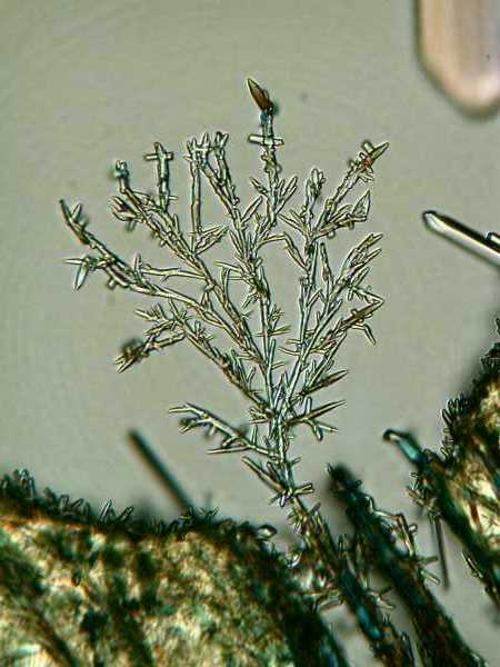 I need to begin by admonishing myself for not following my own advice. I keep telling myself and everybody else who will listen—label everything! Well, the first image is indeed labeled—47A.jpg—but I apparently lost the note (or more likely, never wrote one) identifying this crystal. I suspect—which means, it's a wild guess—that it's from a slide of sodium bicarbonate (ordinary baking soda). I quite like it because it looks like a miniature glass tree to me.