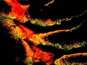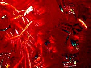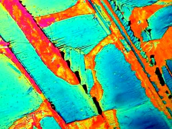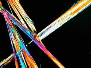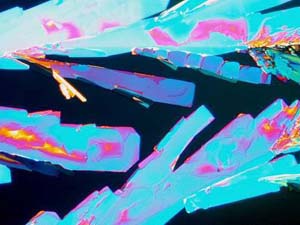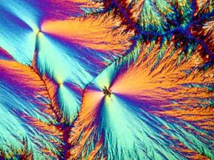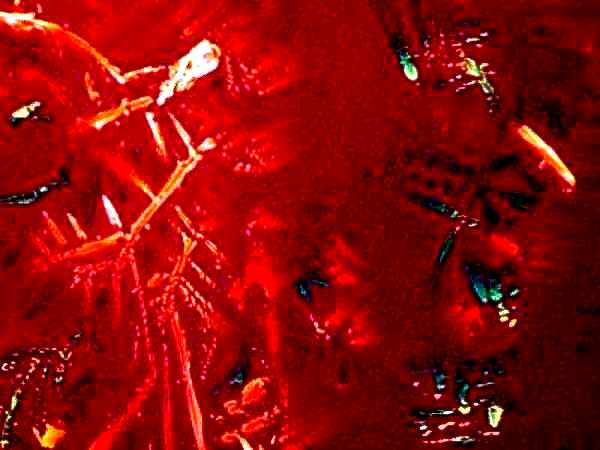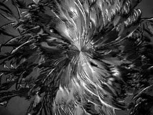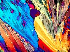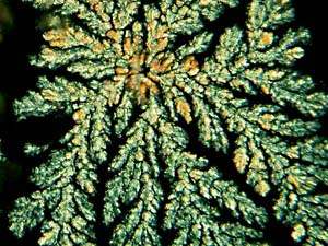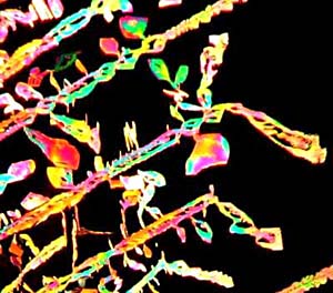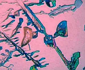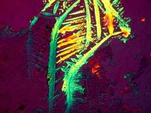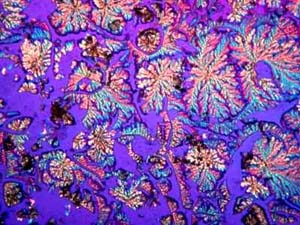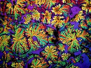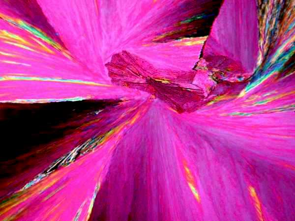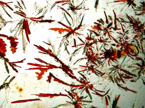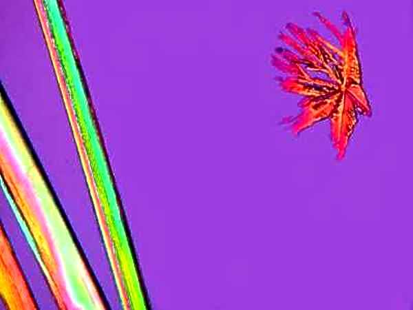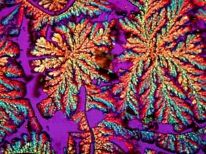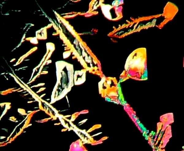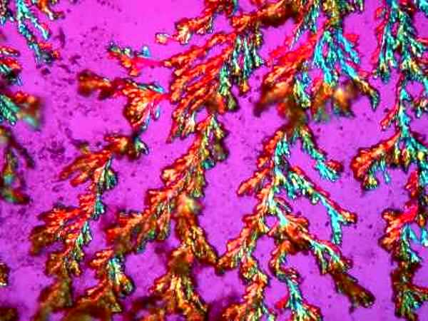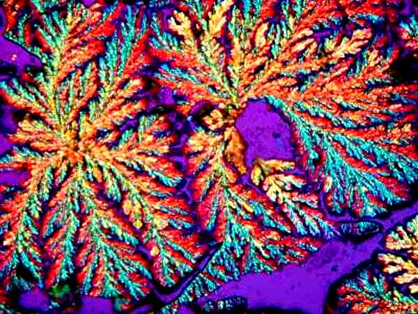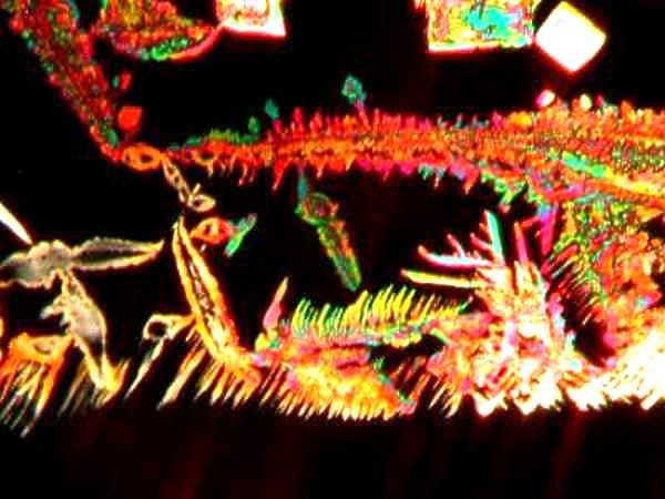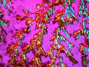 However, again, even such an "ordinary" thing as baking soda can produce some real surprises. Another slide showed radically different forms and, in this case, I was rather reminded of a Navajo tapestry with its bright colors and feather like patterns against a background that emulates white sandstone.