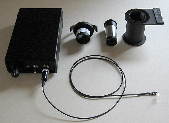 Early tests of the microscope and optics were carried out with a limited form of critical illumination via a converted desk light fitted with a 75 watt photo-enlarger lamp, this worked well enough but is bulky, gets very hot and has no diaphragm . I wanted the microscope to be more self contained so I investigated the possibility of LED illumination. Ideally I would like to use a high quality external Köhler lamp but smaller units have not been made commercially for some time from the 'big makers' and good ones are becoming rare on the second-hand market. [I have not needed one earlier since the microscopes I have previously owned have all had built-in illumination].