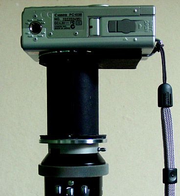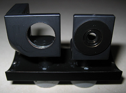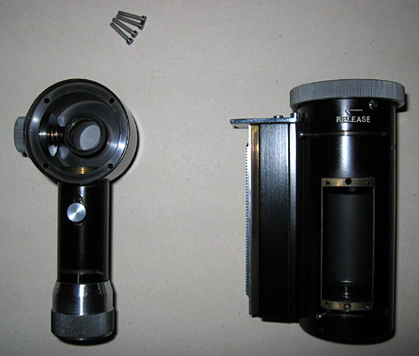 On the left, the LED light assembly replacing the mirror [the mirror can be easily put back on the release of two brass screws] and on the right, the Canon Ixus 400 digicam on its mount.