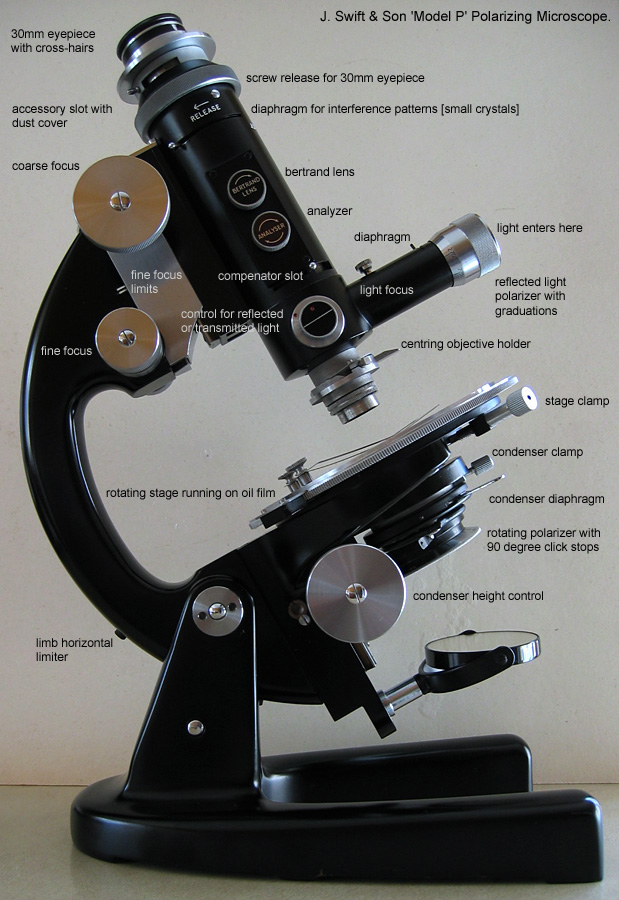 Summing up, after extensively using the Swift 'Model P' on various subjects and working on it for some time I would say it lacks the finesse and finish of similar Leitz polarizing microscopes of the same era (seen in publications) but it's a good basic microscope of the 1950's and has undoubtedly performed the task of quality petrological study in laboratories all over the world and I am pleased in having the opportunity to test one.