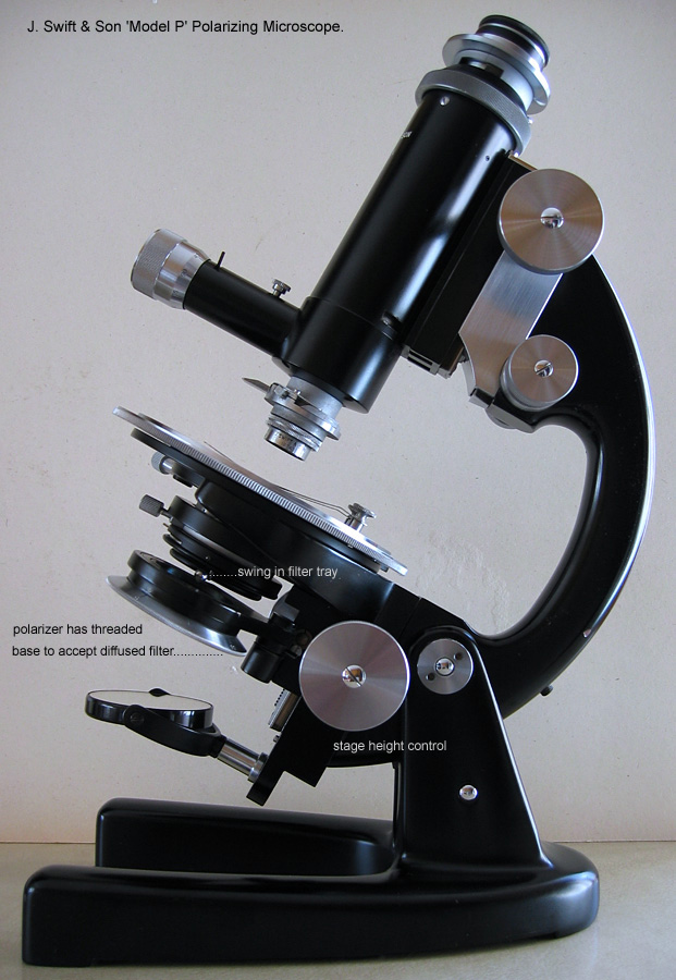 * If anyone can provide further information regarding the Model P, objectives and accessories, especially Swift catalogues of the era it would be appreciated. Although a popular post war polarizing microscope there seems to be little in the way of information on the Internet and other sources.