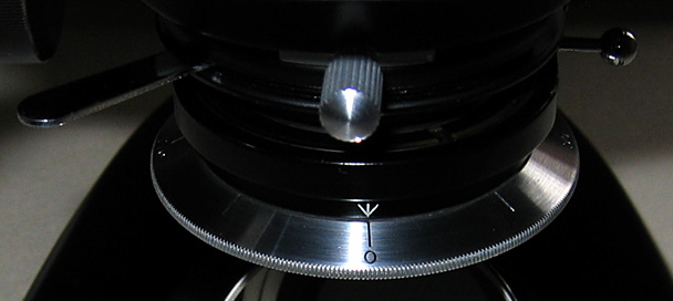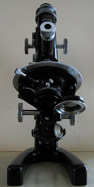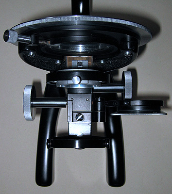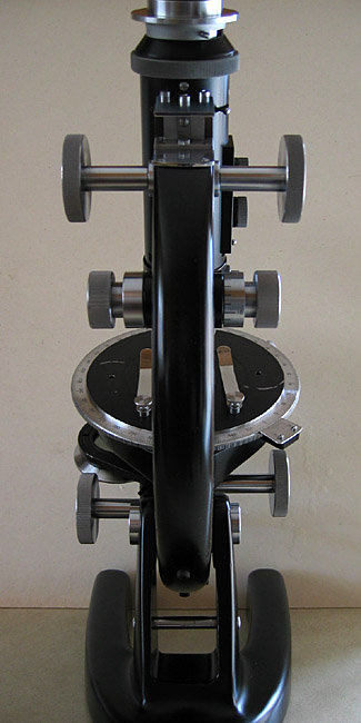 Front and rear views, the left view shows the swing out polarizer and right, the damaged paint on the rotating stage but original stage clips. If anyone can suggest a suitable paint to refurbish the stage properly in keeping with the original finish I would be grateful since most paints I can think of won't take continuous movement from the stage clips or slides I suspect.