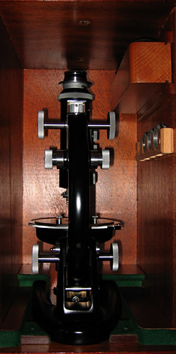 The black enamel was in good condition so a gentle clean with a damp cloth was all that was needed and a gentle buffing up with a dry cloth to bring the lustre back. The machined parts are not lacquered like earlier brass instruments some of which had very delicate and mostly irreplaceable finishes so a steel-aluminium cream cleaner was used made by HG International. Optics were left alone if possible but some external surfaces of the objectives had been attacked by fungus due to storing in a damp environment, confirmed by the minor chrome plated parts on the stand which had rusted to various degrees including the stage clips. The turned parts of some objectives were covered in grime, this was removed by rotating a dampened cotton bud round and round until clean. Each person has his or her own preferred method of dealing with these problems and I am not going to say the way I have tackled it is correct, but I am pleased with the results which hopefully remain sympathetic to the original finishes. An account of my work has now been put into the box, hopefully to remain there so when it becomes an antique in 50 years time somebody can see what has been done in the year 2004!