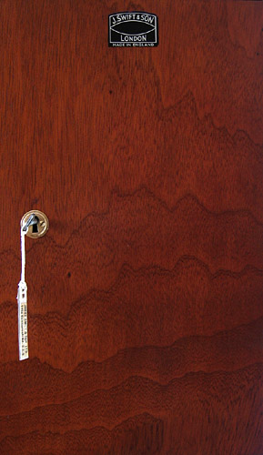 The left image shows an internal shot of the restored box with microscope and accessories and right, the original Swift name plate and beautiful wood grain on the external face of the door. Unfortunately at some time in its life the door had been forced open creating some damage on the left panel probably because the design allows you to close the door with the key still inside! There was not much I could do about this, the rest of the box needed a good clean and some gentle wood restorer applied to bring the natural wood grain back to life. The felt pads needed some work but are now OK. Fragments of an original address label was inside but in very poor condition, part of it was saved, reinforced and made into a smaller label attached to the key as shown in the right image.