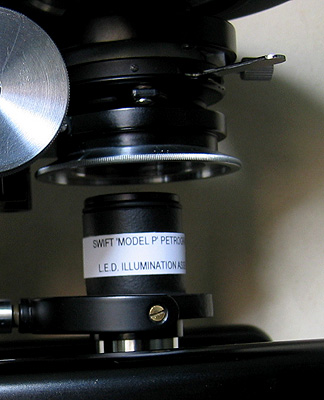 The removable holder for the 30mm eyepiece includes an accessory slot for additional compensators with the correct eyepiece fitted and integral slideable dust cover, again this is an option since some other 'Model P' microscopes I have seen don't have this fitted. I think this assembly accepts more sophisticated Wright eyepieces. Included with the microscope were two Swift 30mm eyepieces both with focusable cross-hairs that are not easily removed, unfortunately this causes a problem with taking images except where the image of cross-hairs may be desirable say in rock sections. I tried a 30mm eyepiece from a Meiji stereo microscope and after a small modification to get it parfocal with the Swift eyepieces, works remarkably well also having the advantage of a high eyepoint suitable for projecting an image onto the lens of my Canon Ixus 400 digicam. However this wide-field eyepiece pushes the capabilities of the Swift objectives too far having not been computed to run with them! This combination though has been used in the images shown later, together with another one of my home made mounts for the Canon. I have also used a 30mm Leitz eyepiece without cross-hairs of similar vintage to the Swift with good results.