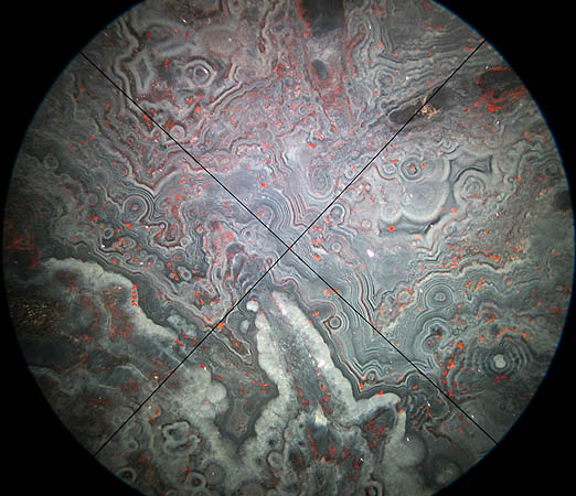 Moss Agate from Brazil under plane polarized light and Rheinberg illumination to show the original Swift eyepieces work well enough, the image shows some field curvature. The cross-hairs can be rotated by moving the eyepiece in its mount. A Watson & Sons slide.