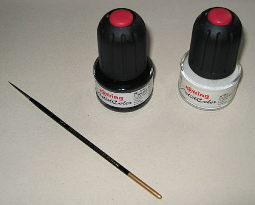 Rotring paints and Prolene 2/0 [from the 101 series] brush by Pro Arte used in restoring markings, the paints are water based and colour fast but when dry are quite resilient to moisture.