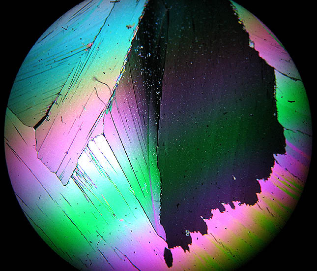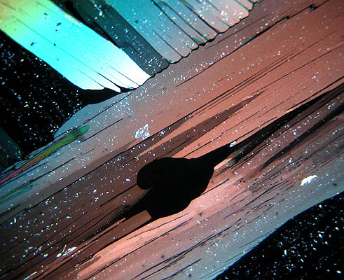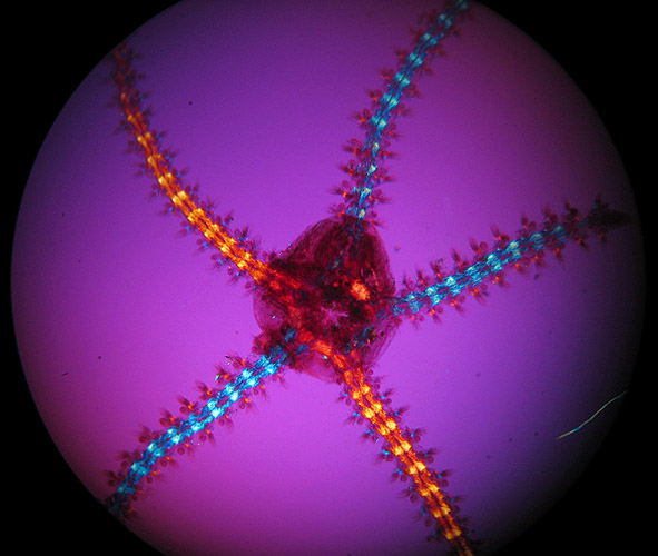 Starfish [a very small one!] with crossed-polars and sensitive tint plate; pity about the internal hair in the preparation the effect of which couldn't easily be removed later in Photoshop. A Biosil slide.
