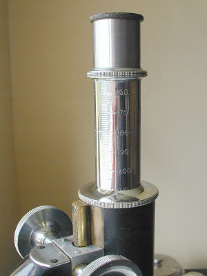 All the controls are soberly smooth and devoid of backlash or play. The fine focus mechanism is a delight to use and is neither too stiff or too free and would be capable of adjusting the x100 oil immersion objective when fitted to the nosepiece. The rack mechanism is unusual in having a circular cross section matching that of the limb as can be seen above. This utilises part of the tube as a sliding bearing which is also circular of course and such was the accuracy of its initial machining that this combination of curved/linear surfaces are still mating perfectly to this day. Note too the extending draw tube which not only caters for 160mm objectives but those of up to 210mm, which are still to be found for sale today and cheaply too. Smoothly collapsing or extending, this example of draw tube with a chromed surface is very positive and is the easiest I have ever used.