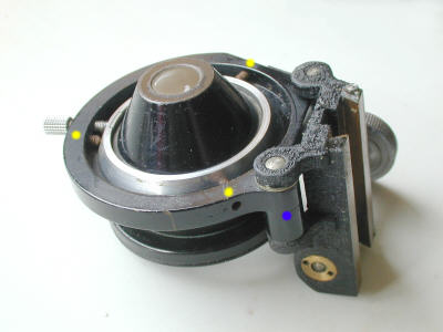 The condenser is a dry Abbe of about 1.0na and can be centred by adjusting three grub screws as shown above. This is not ideal, for it is not a quick user method since it takes several minutes to accomplish with an Allen key, but once centration is achieved there is little need to readjust for 99% of observational use. Undoing the chromed thumb screw releases the condenser allowing for other substage optics to be inserted such as for phase contrast and darkfield. The iris is straightforward in use, and also a convenient 'click stop' feature gimballed as shown, ensures the speedy swinging out of the condenser for very low power use. The latter is very positive and well made.