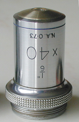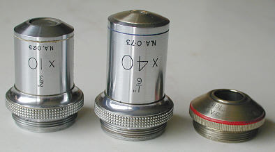 Having established that the stand is very well made, though a trifle sparse in user adjustment refinements, I can state with confidence that the optical side of things is very capable of delivering quality images. The images were almost 'plan' flat within the modest field of the x10 Huygenian eyepiece, though eye relief was only moderate, being typical of this 50's offering. The objective's somewhat higher na than those of contemporary optics again reveals signs of earlier optical design concepts. Other revealing signs of its age can be seen from the objective's designations, where both the modern x40 and x10 and old 1/6" and 2/3" symbols can be seen, and of course a lack of a sprung nose for the x40. The 45mm low power ( about x 3 ) is a simple achromatic doublet and is fine for low power scanning of slides though it is not parfocal with the other two objectives.