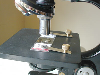 You might recognise that the stage clips are not original: In fact I made them since this 'scope came to me without clips, but mine are shorter than the traditional sort and have hard rubber grommets at the ends to raise the metal strips above the glass and reduce wear on the labelling as well.