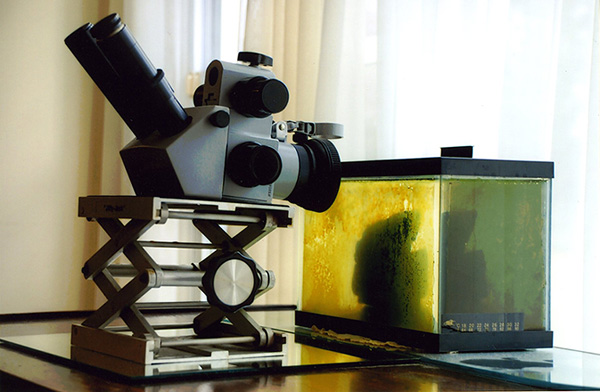 Currently, I use a LOMO MBC-10 stereomicroscope removed from its base and placed horizontally on a chemistry stand (figure 2). The advantages of this set up which I consider ideal are the sharp, wide field of view provided by the microscope, the long working distance that allows comfortable placing of the instrument and its base, and the option to change magnification from 8x to 56x. One of the oculars has a pre-calibrated micrometer so that I can readily measure an object of interest happens to appear. The fact that the ocular tubes are set at 45º means that although the body is placed horizontally one looks through the oculars in the usual manner (no need to bend up one's neck). The objective looks head-on at the aquarium glass. For my observations, I have a strong preference for the 16x combination obtained by the use of the 2x objective in conjunction with the 8x/23 wide-field oculars. The balance of magnification and field size makes it perfect for both searching and observing. The adjustable stand rests over a 26 x 12 inch glass plate (a surplus from the hardware store); it allows moving the microscope vertically. The glass surface underneath allows displacing the microscope and its base sidewise to search for objects of interest, or back and forth for focusing. It is remarkable how tolerant the microscope is for operating at this magnification to the fact it is focusing through a 1 mm-thick plain glass wall.