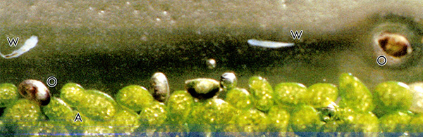Figure 3. The air-water interface adjacent to the micro-pond wall. At this point capillary action forms a water film that extends about 2 mm above the water surface. This area is a favorite feeding ground for microscopic worms (W) and ostracods (O). Myriads of Wolfia arrhiza (A) float on the water surface; one on the left shows the typical division by budding. The worm to the right moved during the relative long exposure (1/8 sec) but by a happy coincidence it serves as an internal marker to the picture; it is almost exactly 1 mm long.