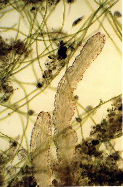 I have described above the set up I presently use and find more convenient for observing the type of “pond life” interest me more at this time that is to say, freshwater invertebrates. My favorite “searching ground” is the water-air interface as seen just across the glass wall. Many forms of life are present and easy to observe. There are invertebrates of many types, rotifers, mites, hydras, cyclops, ostracods, occasional insect larvae, caddis-worms (which are not worms, but also insect larvae), and among the plants the duck weed Lemna minor, and the ubiquitous Wolfia arrhiza (Reid, 2001. Figure 3). What is beyond this magnification level for the most part, are any fine details of the structure of protozoa and most of the single-cell algae. Large protozoa appear as whitish specks of matter moving at various speeds. Some of the unicellular algae are distinct enough to be identified at 16x with good illumination (example Closterium) but that is all. The temptation to switch to higher magnifications is promptly checked by the realization that what one gains in magnification one loses in field diameter, in light intensity, and in general convenience of operation. In a word, for work at higher magnifications, the way to proceed is to take a sample using the view offered by the stereo microscope if possible, and to examine it further under a conventional transmission microscope (figure 4). The important point is how much can be seen with just 16x if a steady set up and good illumination, transmitted light in this case, are provided.