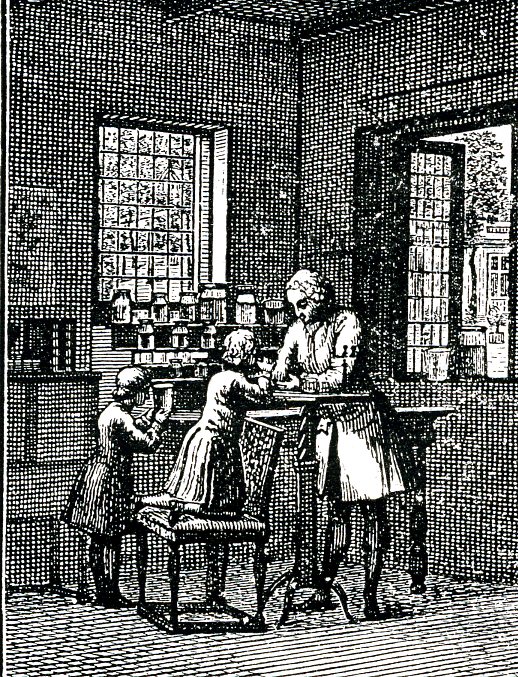 Figure 6. Abraham Trembley was tutor of the children of Count Bentinck, in Sorgvliet, near the Hague, Switzerland. He is shown here with his pupils; notice the child at the left looking into a micro-aquarium while several micro-aquaria are placed by the windows (from Scherren, 1904).