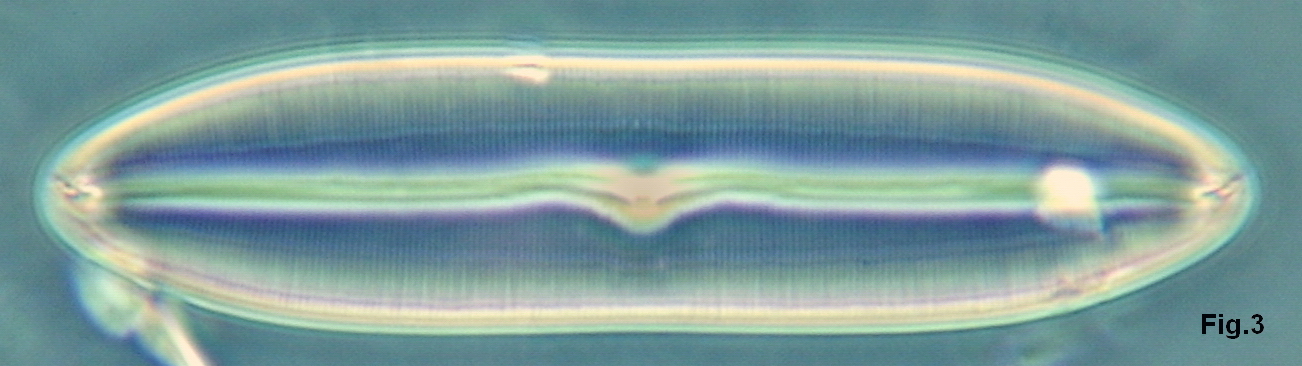 The images are of a delicate and finely structured Caloneis species and were not digitally processed except for cropping. In brightfield (Fig. 1), the striae are resolved, contrast is rather low at fully illuminated aperture; with peripheral annular illumination (Fig. 2) contrast is greatly enhanced and some striae are partially resolved into “dots”; with a true phase-contrast objective of high quality (Leitz 40/0.75 apo PV, Fig. 3) contrast is very high but resolution is inferior as its NA is lower.