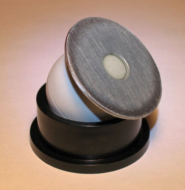 Photo 2: Prototype II - 2 inches in diameter with approximately 30 degrees maximum tilt and an smooth epoxy plastic surface. I use modelling clay to hold specimens on this style of table.
