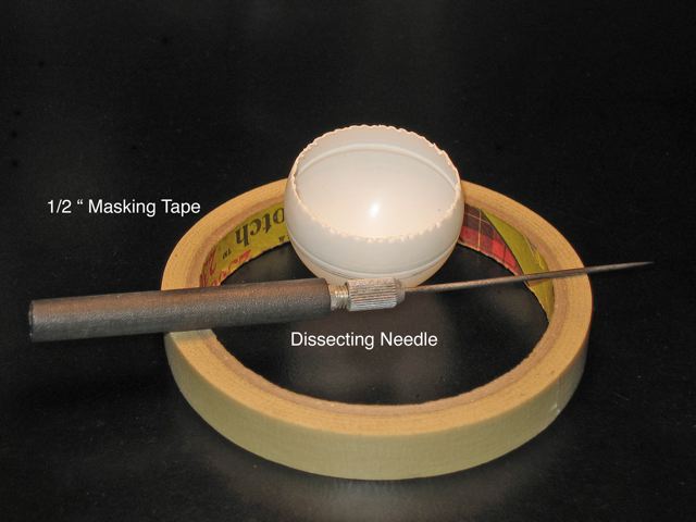 Photo 7: Steps 5 & 6 - Use masking tape to provide a cutting guide for the ping-pong ball. Use a needle and make a closely spaced series of perforations along the cutting line and then, and only then use a sharp knife to cut off the top of the ball. Glue the cut ball to the sanded side of the fender washer with epoxy glue. Let the epoxy glue set.