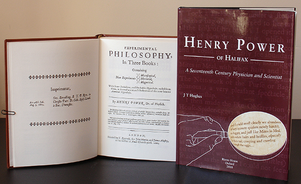 Two books recently published by Rimes House which make Power's work more widely known. A photographic facsimile of Power's 'Experimental Philosophy' 2009. In the preliminaries it states that it was printed on 135 gsm paper and being well bound and with a leatherette covering it provides a pleasingly tactile and antique feel to the reader of this classic text. In the preliminaries it is noted that although the 'Microscopical' book is dated 1664 'copies were available in 1663'. 'Henry Power of Halifax. A Seventeenth Century Physician and Scientist.' by J T Hughes 2010. The author notes that it was written and published to complement the facsimile of Power's book. |