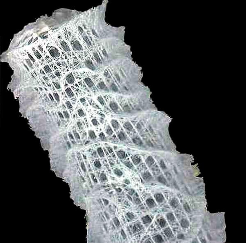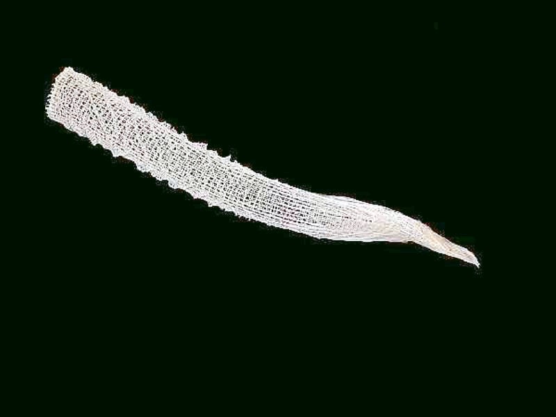 Finally, the long white tube extending our from under the “jungle” starfish downward to the edge of the bowl is the skeleton of the glass sponge Euplectella aspergillium, one of the hexactinellid sponges which have 6-pronged spicules. I’ll show you 2 images; first, the complete skeleton and then a closeup which shows some of the detail of this remarkably beautiful structure.