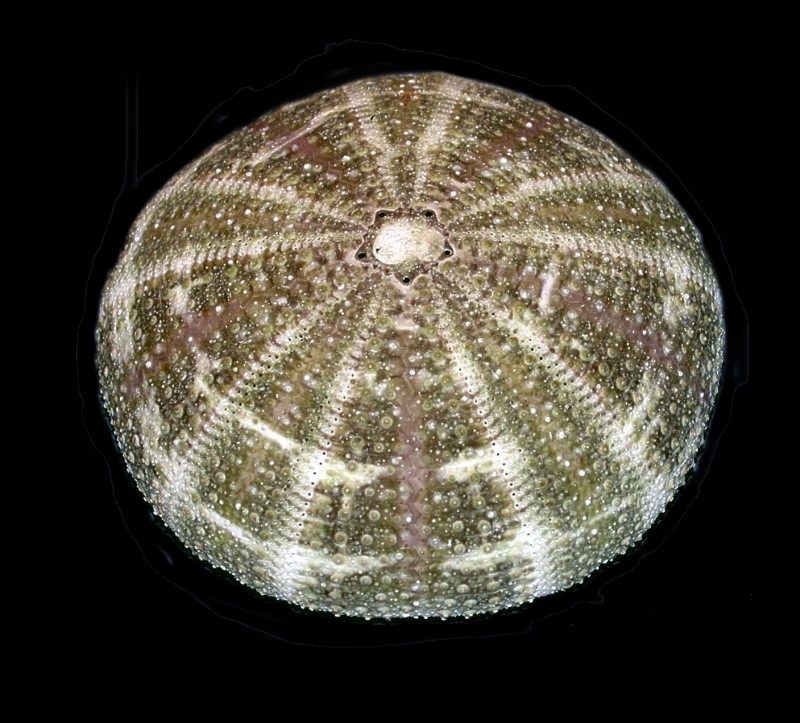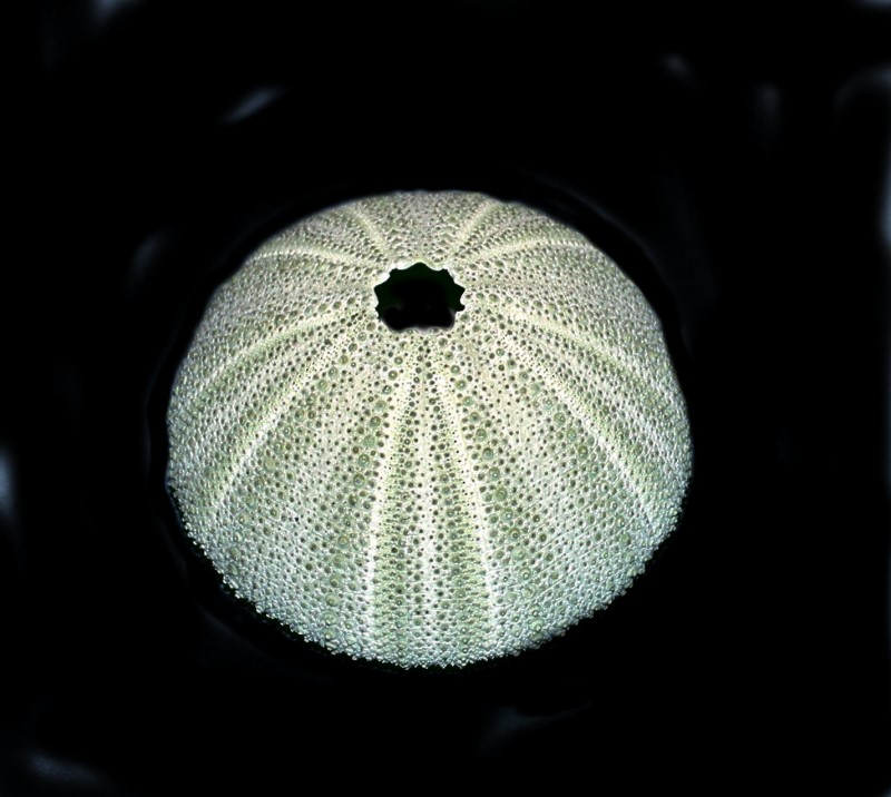 Here is a sea urchin from the bowl of quite a different sort. This is a green urchin, Salmacis spheroides and the minute markings on the test are particularly remarkable when you realize that each little knob is a place where a spine was attached and each tiny hole is where a tube foot extended through.