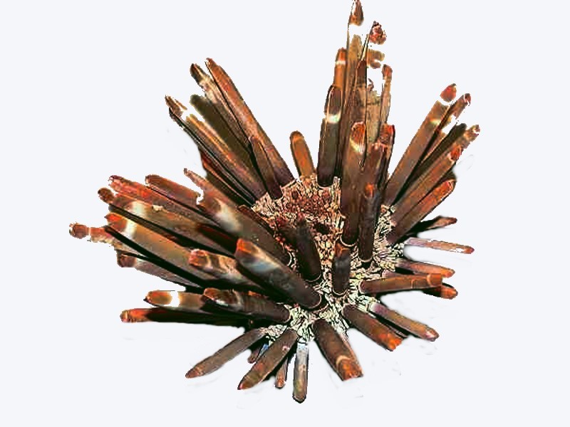 The large club spine urchin from the bowl is a specimen of Heterocentrotus mammilatus. These are tropical organisms and are widely collected and craft shops often sell packets of the spines.