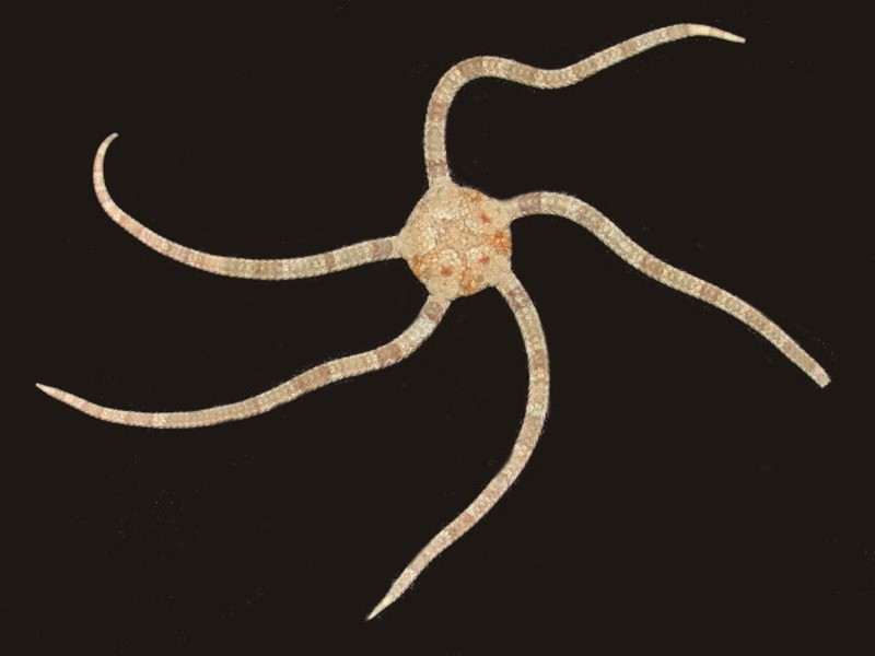 Here is another species (both this one and the one above are tropical forms from the Philippines). This one has retained more of its color. Some species are brilliantly colored. Brittle stars can occur in enormous numbers and certain of them in the ocean bed are sometimes described as “sea gardens” with thousands and thousands of ophioroids snaking across the substrate.